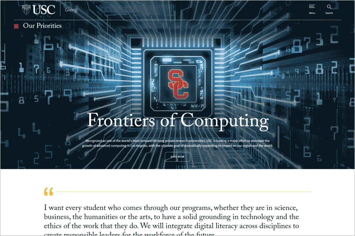 The University of Southern California's (USC) Frontiers of Computing is a $1 billion initiative dedicated to advancing computing research and education. My team contributed by designing the SC interlock chip graphic, and I was responsible for animating the glowing effect bursting outward. The SC interlock was used as a lead image for this initiative in several key elements, including web banners, digital ads, social media assets and newsletters.